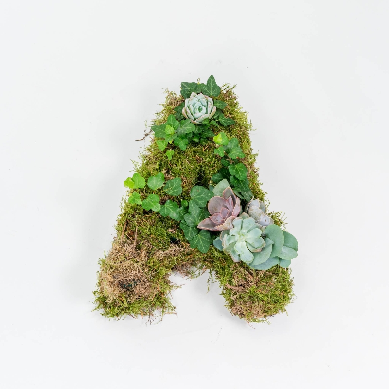 A woodland inspired tribute letter of your choice made up of ivy, succulents and moss. These tribute letters are carefully designed so that if you wish, the succlents can be removed and repotted as a lasting tribute to the Deceased.