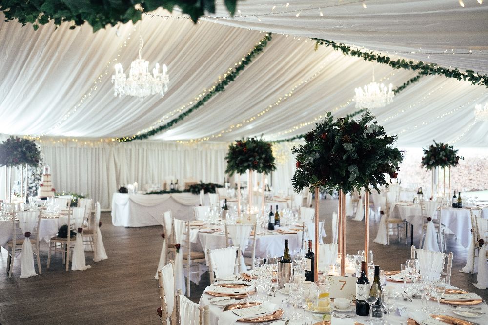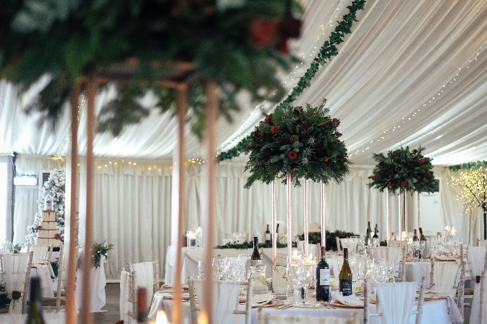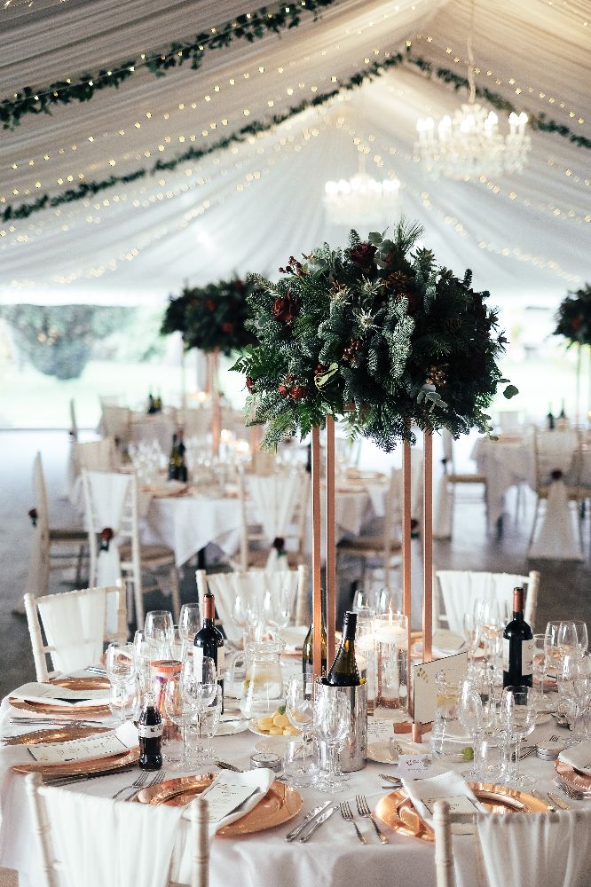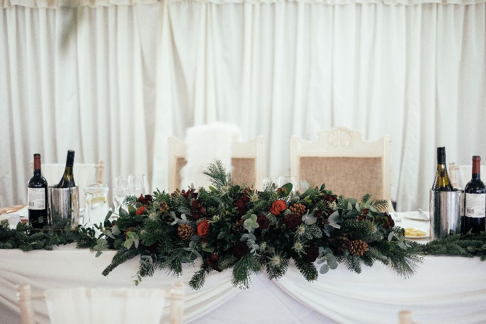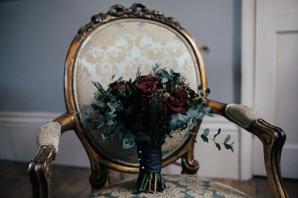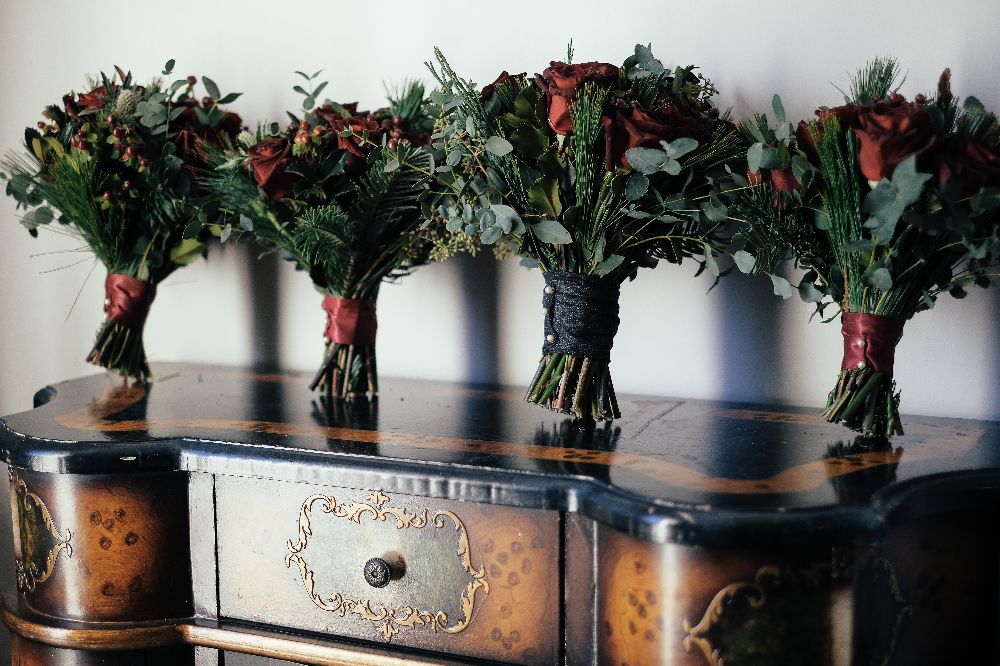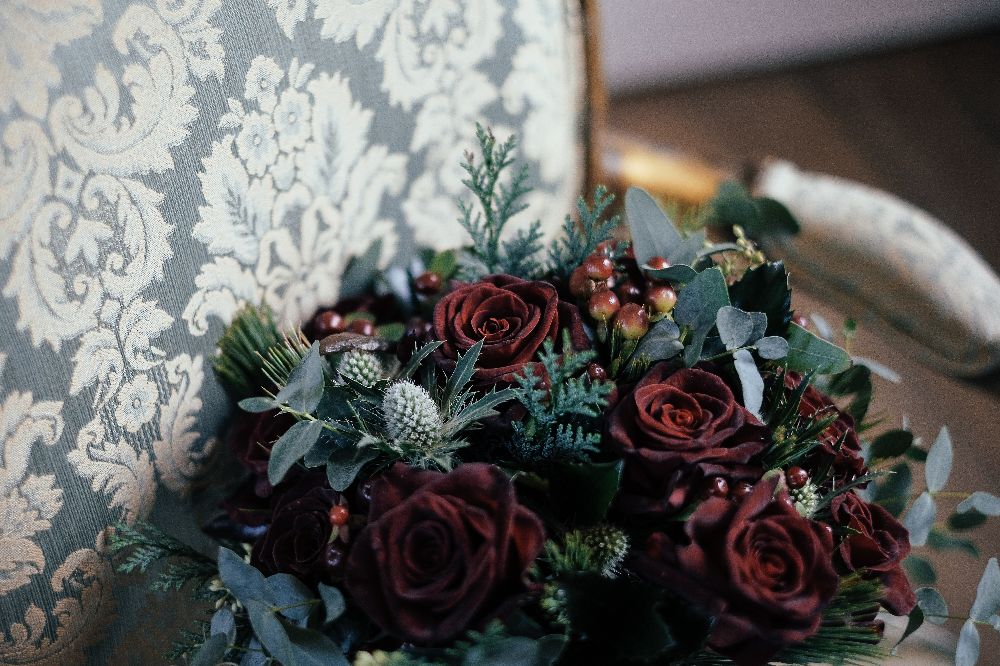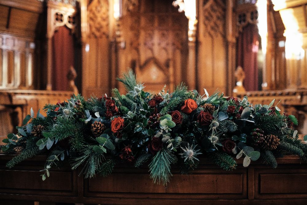 Dark and velvety Black Baccarra roses were used in abundance for this very festive wedding at Stanbrook Abbey.