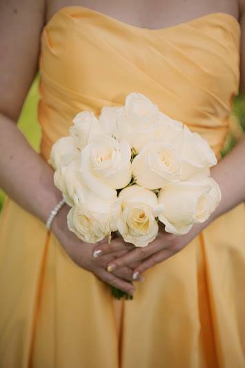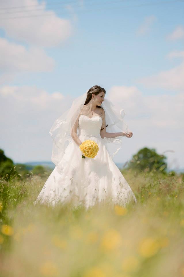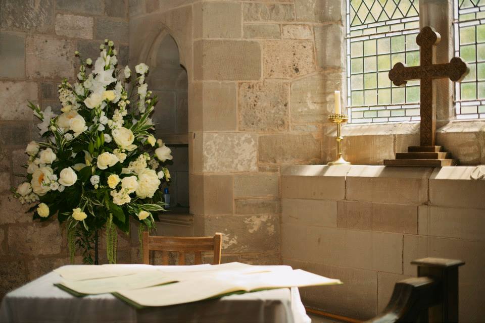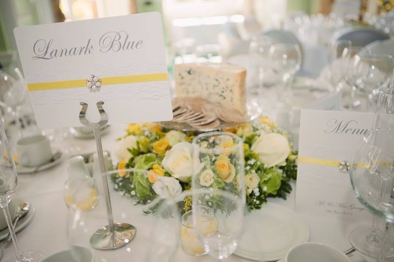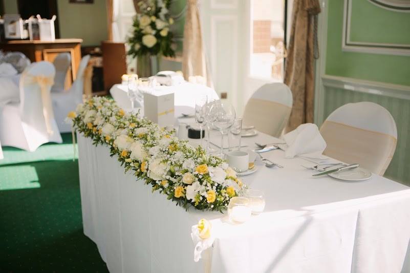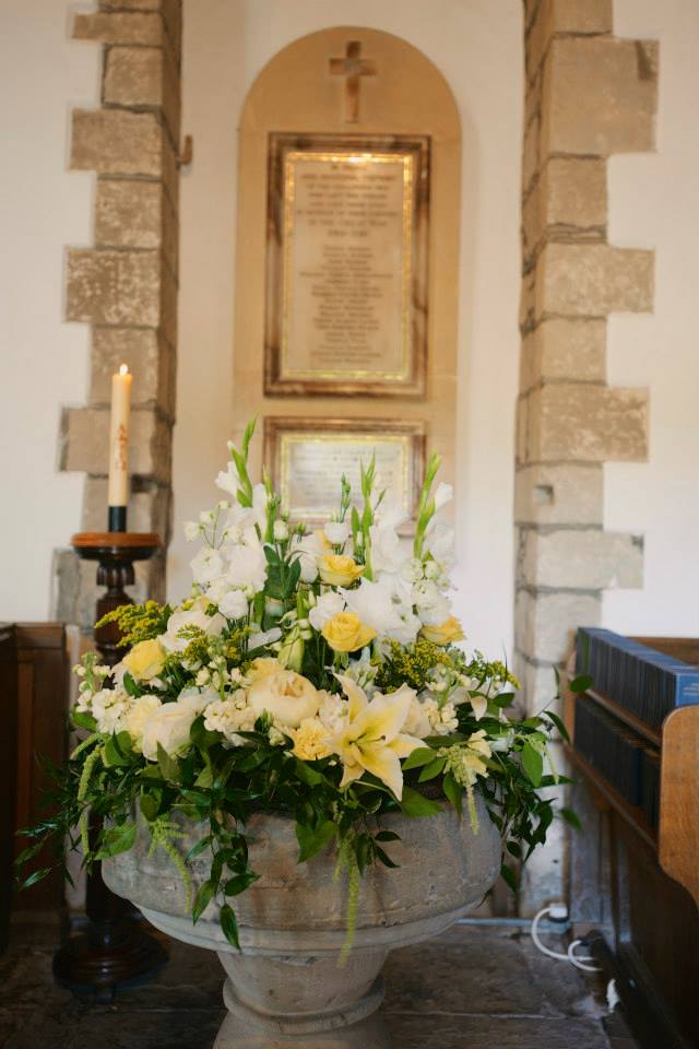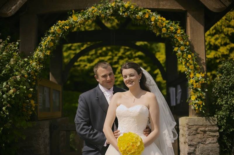 For the lovely Jaymie and Tom, we had the pleasure of creating stunning arrangements with bright yellow roses. A stunning floral arch framed the entrance to the church, which was packed to the rafters with cheery yellow and white arrangements and as an An extra quirk to the day the table arrangements for the wedding breakfast, were all topped by glass plates holding different varieties of cheese! - Such a lovely idea!