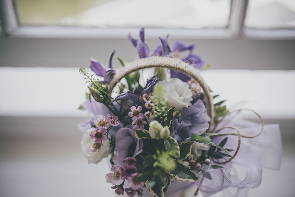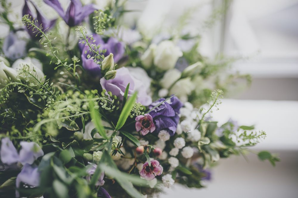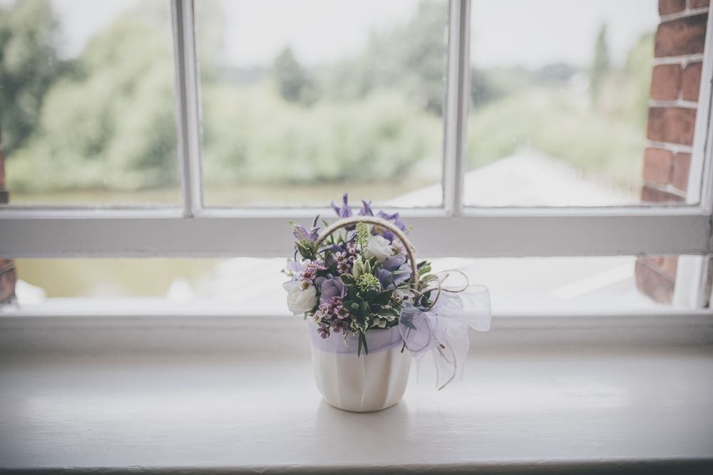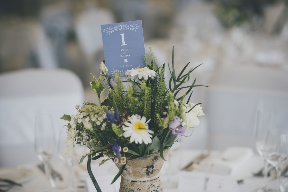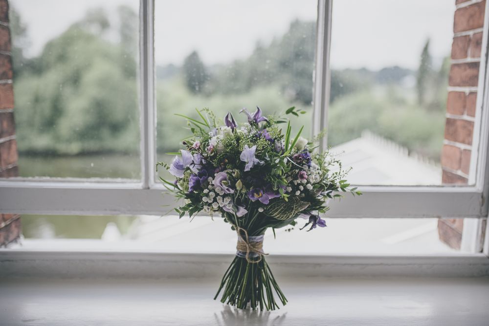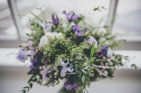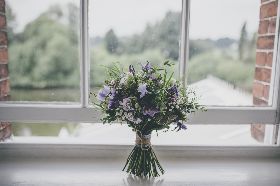Ali wanted a relaxed and classic english country garden look for her wedding to Matt at The Diglis House Hotel. She chose a muted pallate of freesia, lissianthus, gypsophila, wax flower, veronica, scabious and thlaspi to compliment her lilac and blue colour scheme.