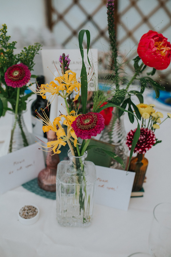 This was our first time to Worcester Glamping – we LOVED dressing the yurt with hanging flowers and filling hundreds of bottles and tea pots collected by the couple with bright blooms to dot around the venue.