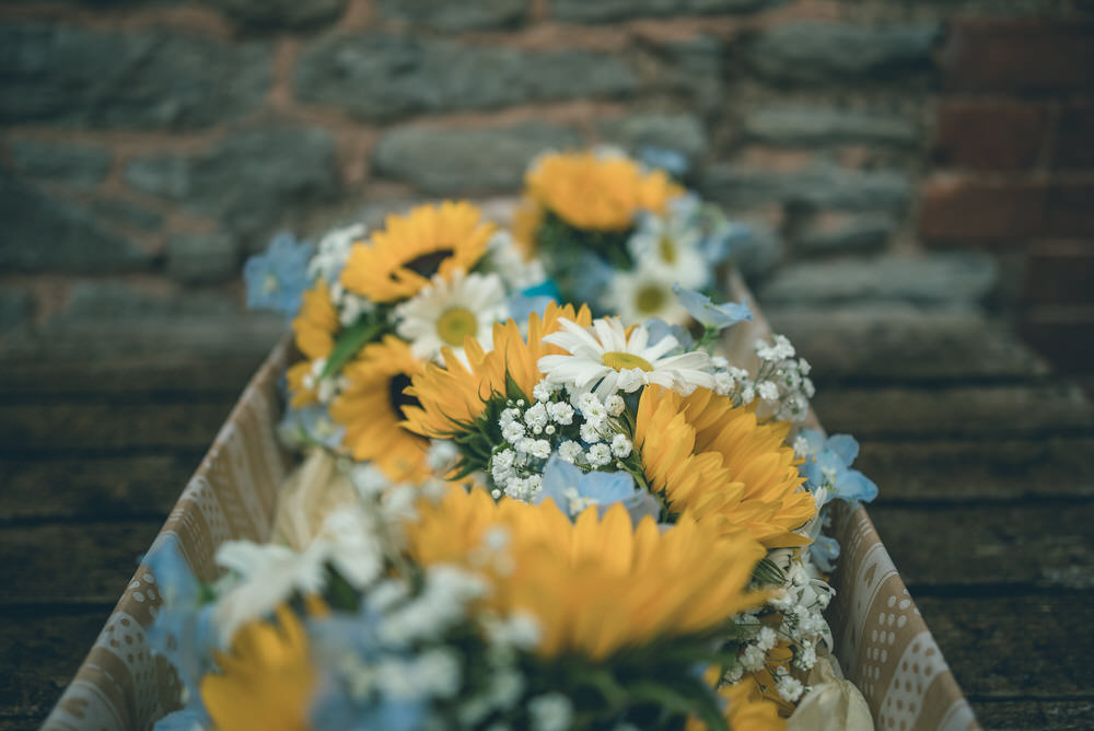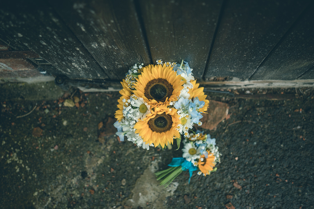 For the wonderful Rebecca and Mark we had absolute joy in creating beautiful arrangements of bright sunflowers and pale blue delphiniums to compliment their intimate wedding at Birtsmorton Court. The bright yellow of the sunflowers matched perfectly with the happy, relaxed and very personal mood of the day.
