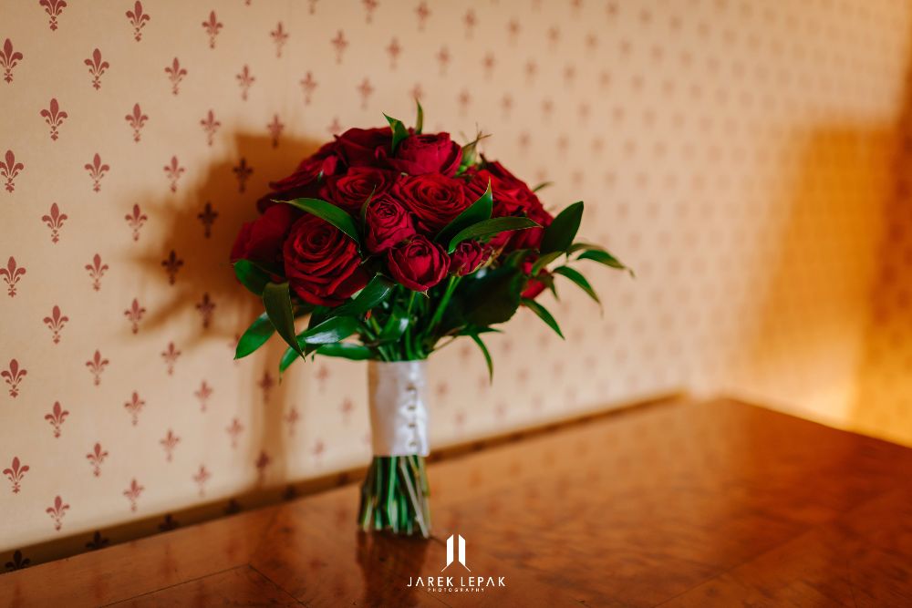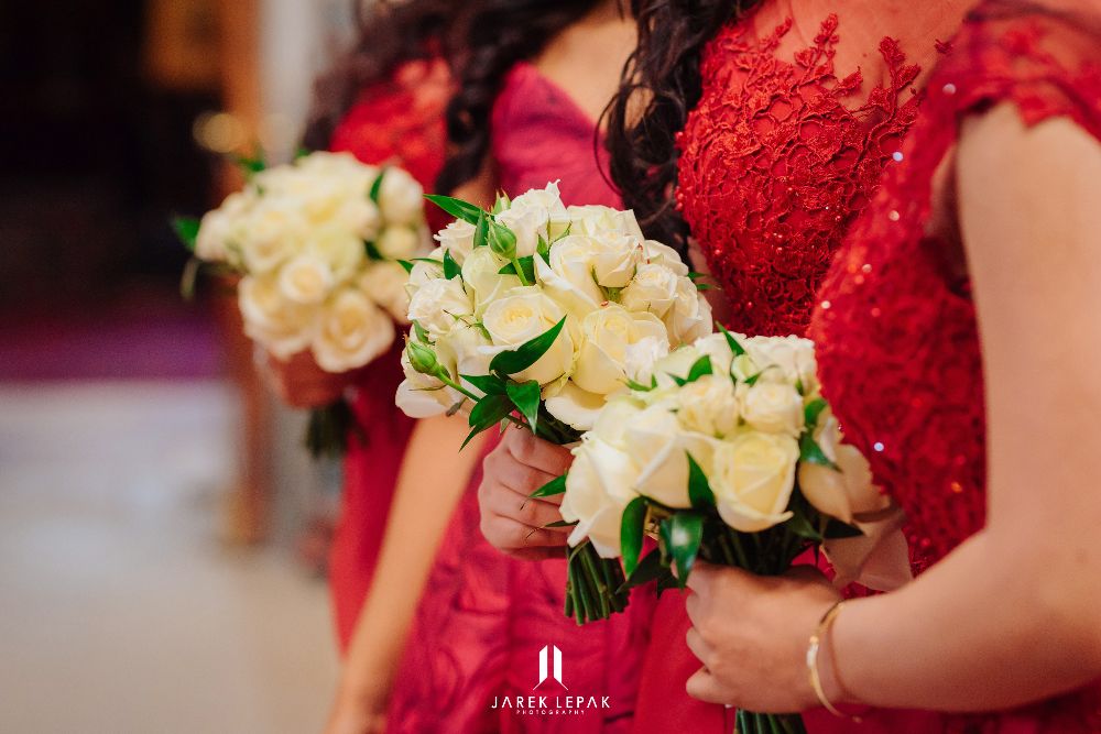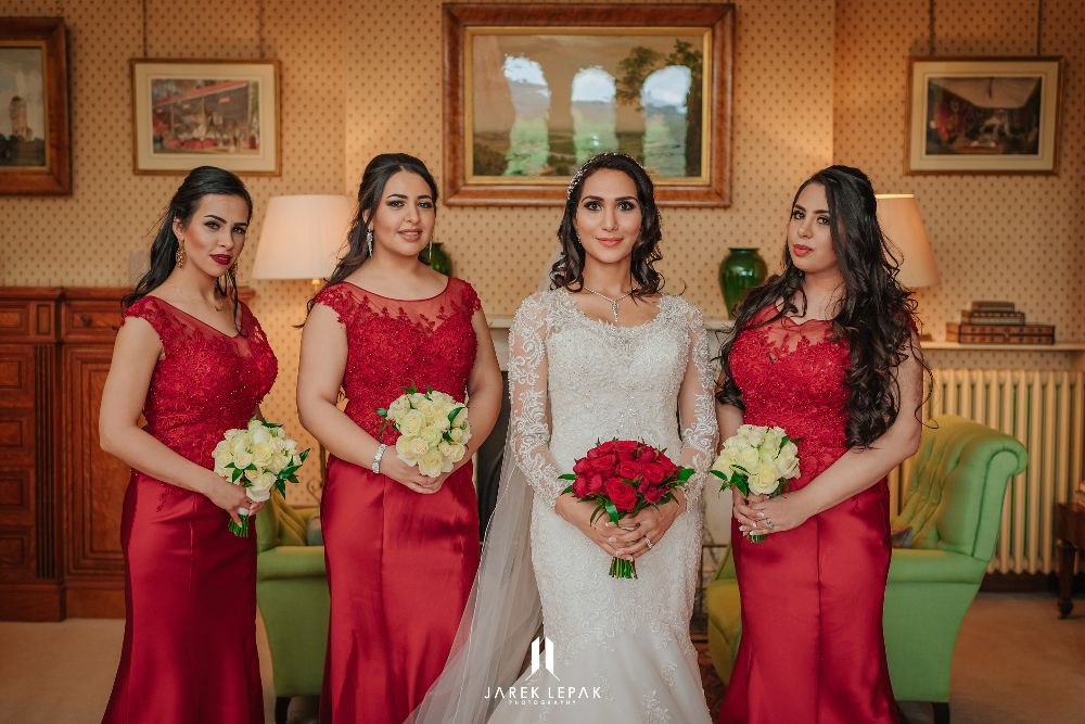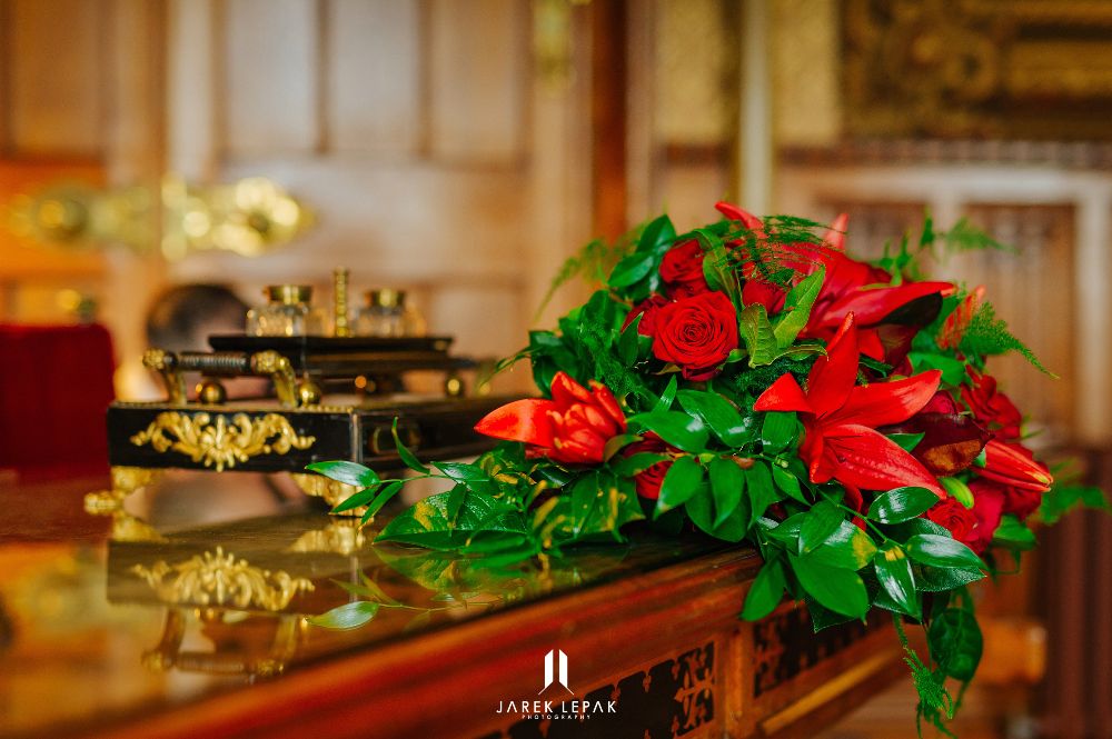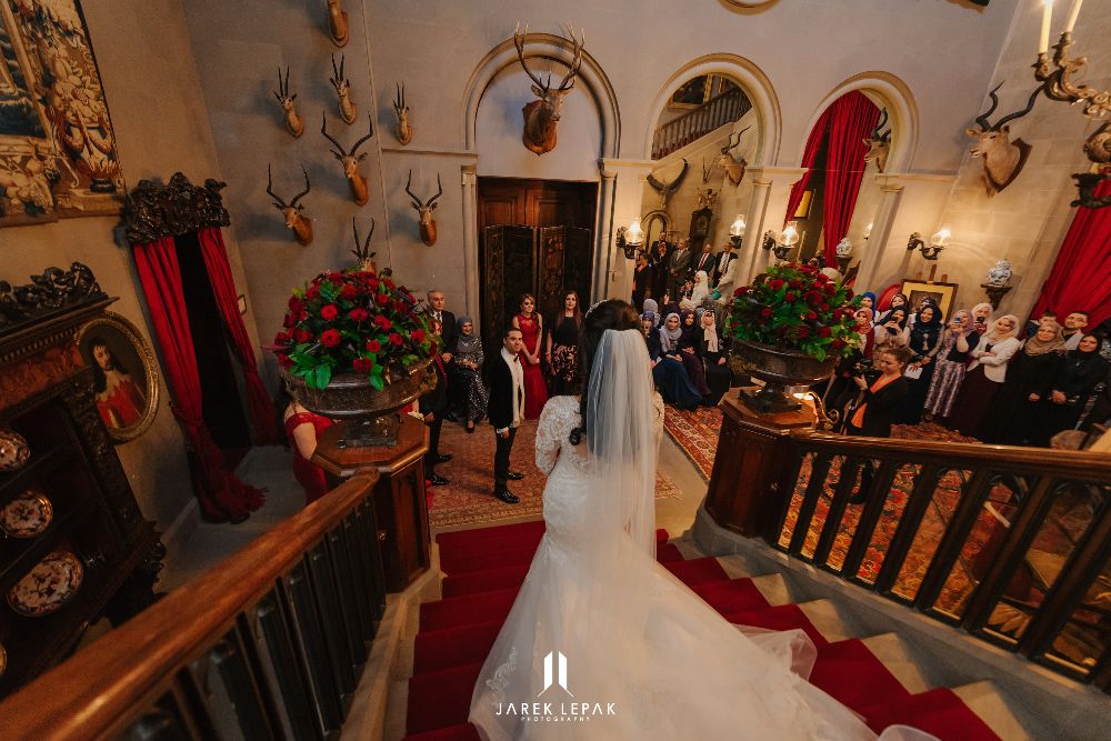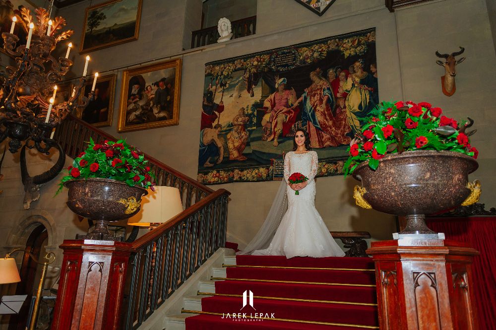 Zainab chose to carry a classic and romantic bouquet of grand prix roses with lush green foliage, with her maids carrying complimenting but contrasting ivory bouquets. The roses were also used in the couples candelabra table centres and to fill the large urns which flank the castle's stair case.