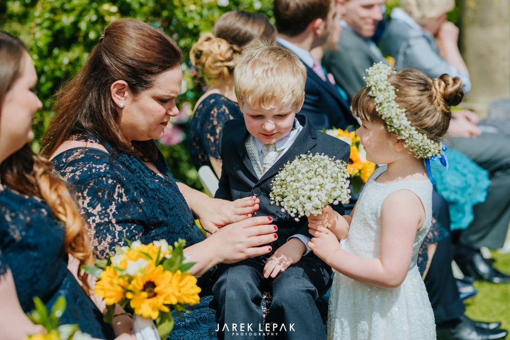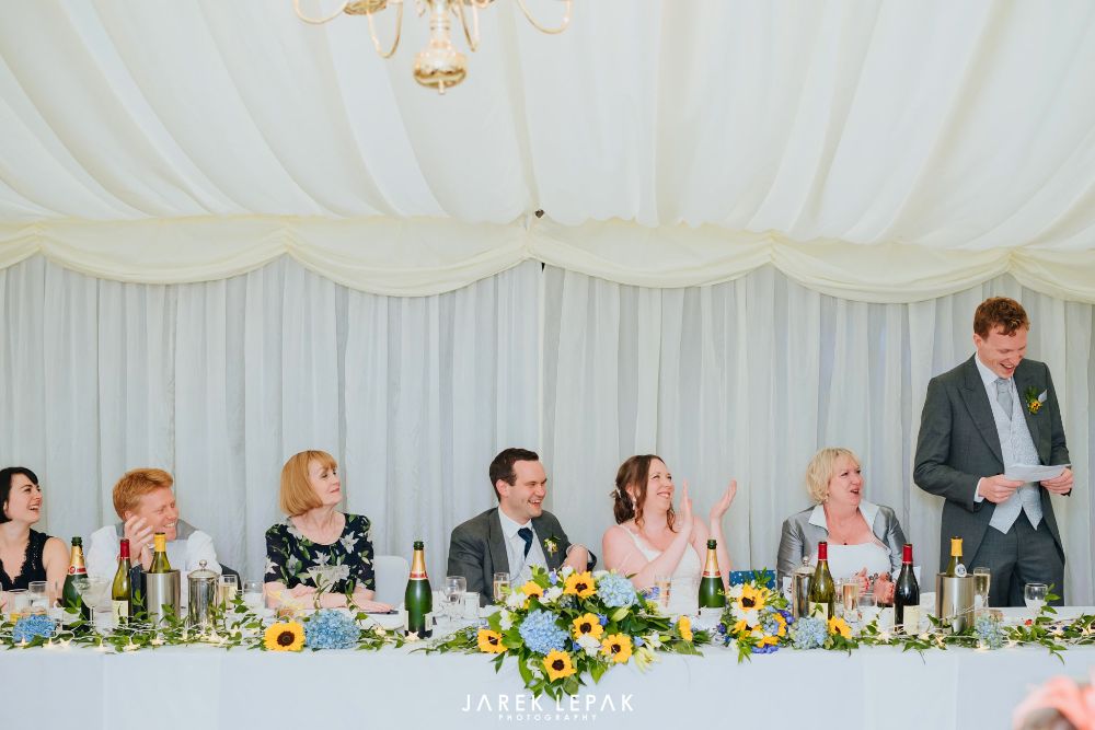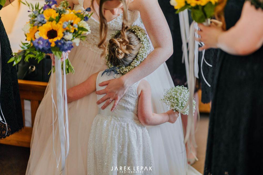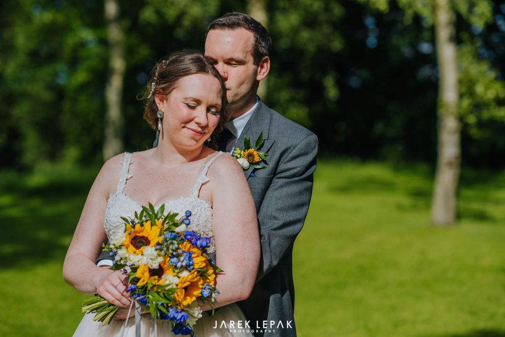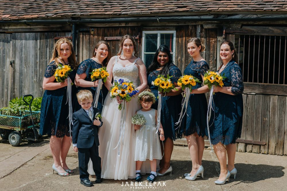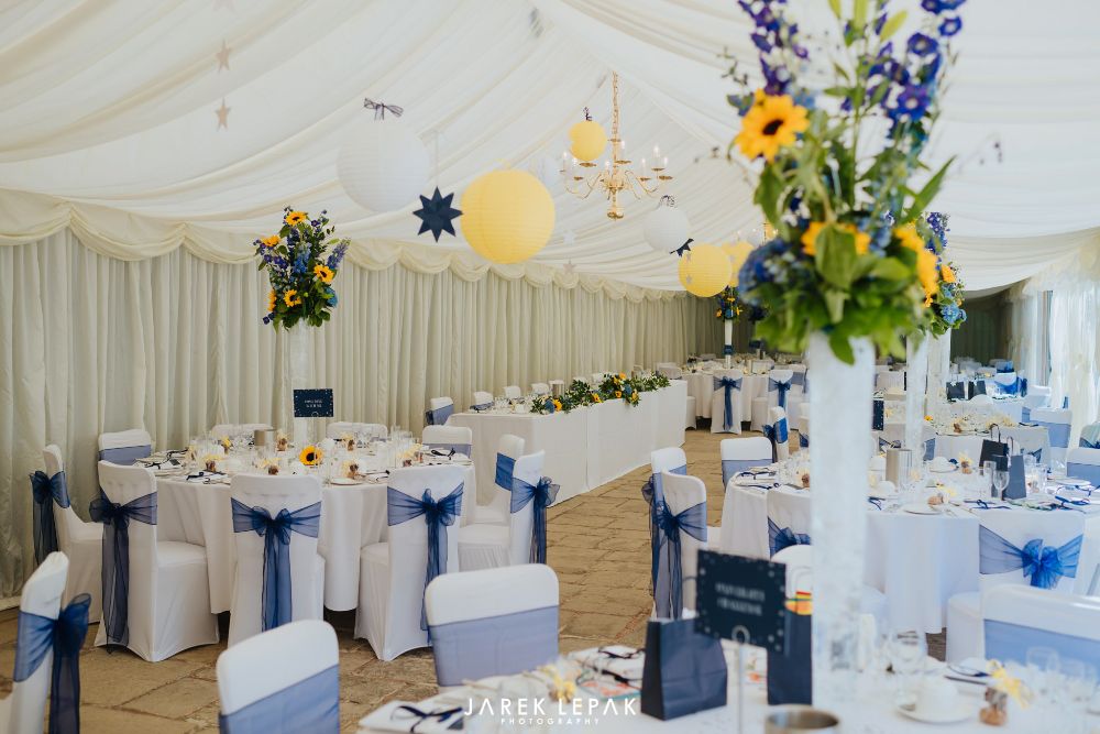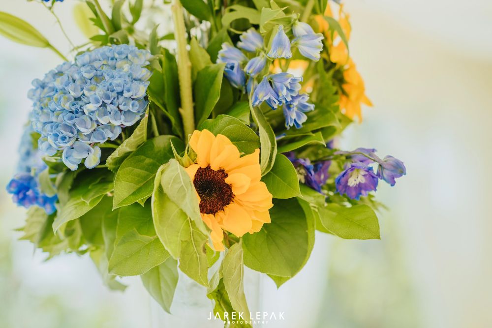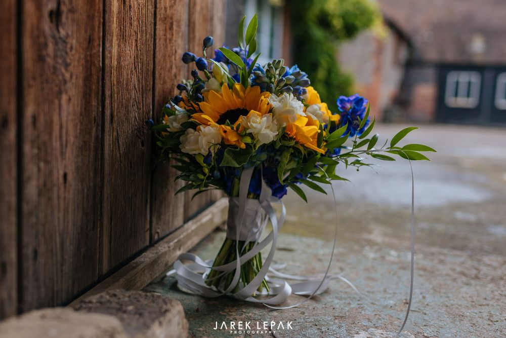 Stephanie and Arthur married at Birtsmorton Court in early June. The couple wanted their flowers to reflect their chosen theme of "Sun, the moon and sky" and so chose a selection of blue summer flowers including hydrangeas and delphiniums together with bright happy sunflowers to create a bright and summery look.